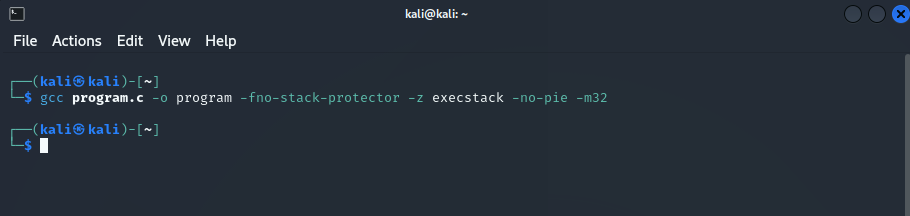 Poniższy screen pokazuje, jak wygląda polecenie kompilacji kodu z flagami, umożliwiającymi wyłączenie zabezpieczeń. W ramach uproszczenia, kod został skompilowany w wersji 32-bitowej.
