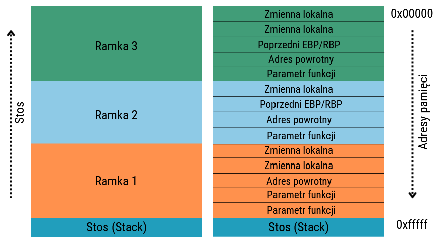 Podczas uruchomienia programu wywoływana jest funkcja main. W miarę wywoływania nowych funkcji tworzone są ich ramki (stack frame), które trafiają na stos, a ich adresy są coraz niższe. W ramkach znajdują się m.in.: